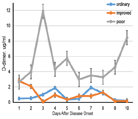 南京医科大学从湖北省三家医院招募了279例COVID-19患者举行研究,效果显示:入院时,改善组和恶化组的D-二聚体水平高于通俗组。经治疗,改善组D-二聚体水平逐渐降低,而恶化组由于病情没有获得有用控制,D-二聚体仍坚持较高水平,说明D-二聚体水平的动态转变与COVID-19的预后泛起出一定的相关性[4]。