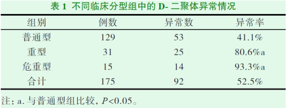 对武汉雷神山医院收治的175例成人新型冠状病毒肺炎患者举行研究,以D-二聚体值>0.55mg/L 为异常,效果批注:重型、危重型患者D-二聚体异常率显著高于通俗型组,且危重型患者D-二聚体水平显着高于重型和通俗型,提醒可将D-二聚体作为评价成人COVID-19的严重性指标[6]。