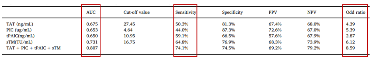 Ò»Ïî¶àÖÐÐÄǰհÐÔÊÓ²ìÑо¿Åú×¢TAT¡¢PIC¡¢tPAICºÍsTMÔÚ²î±ð»ù´¡¼²²¡µÄDIC»¼ÕßÖÐÌåÏÖ³öÓÅÒìµÄÕï¶ÏÐÔÄܺÍÔ¤ºó¼ÛÖµ£¬TAT¡¢tPAICºÍsTMÔÚpre-DICµÄÕï¶Ï¾ßÓÐÒ»¶¨µÄÒâÒå¡£±ðµÄ£¬ÐÂѪ˨ËÄÏîÍŽá¼ì²â¿ÉÔöÌíAUC¡¢Ñ¸ËٶȺÍÓÅÊÆ±È£¬¾ßÓиü¸ßµÄ¼ì²âЧÄÜ£¬ÓÐÖúÓÚʵʱ¸ÉÔ¤¡£